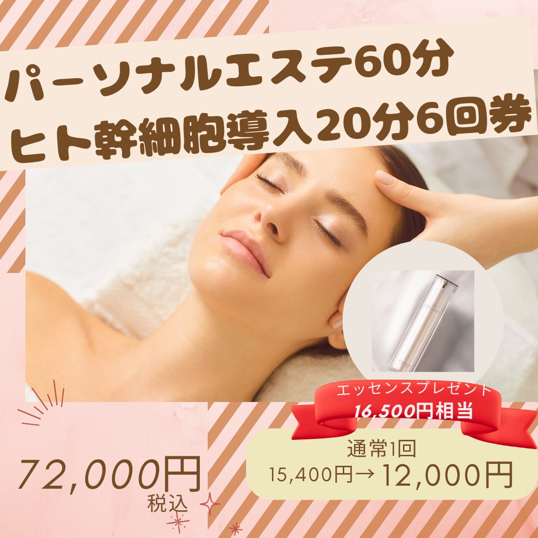 【春のキャンペーン】パーソナルエステ60分+ヒト幹細胞導入20分 6回券+エッセンスプレゼント